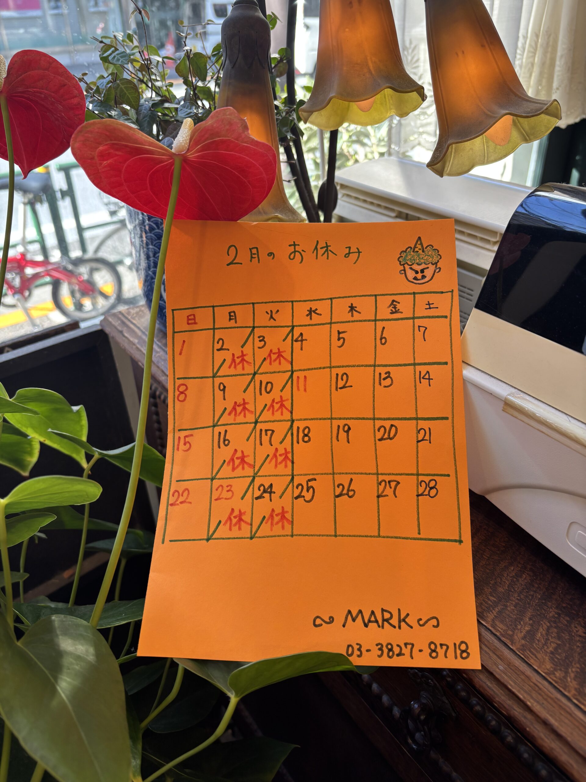 2月のお休み 2026年1月31日 最終更新日時 : 2026年1月31日 MARK Salon 寒い日が続いてますが、みな様体調など崩してないでしょうか? まだしばらく寒さ続きそうなので、体調崩さぬよう気をつけましょう。 電気ブランケットをご用意しておりますので、お気軽にお声かけくださいね! 以下、2月のお休みのお知らせです。 お電話にてご予約お待ちしております。 よろしくお願い致します🙇♀️